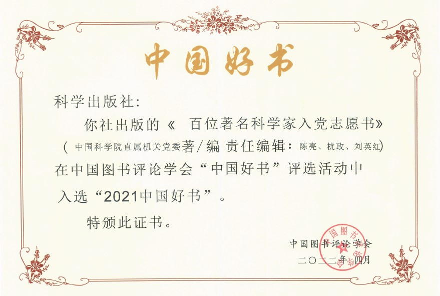 適逢第27個(gè)“世界讀書(shū)日”,由中宣部指導、中國圖書(shū)評論學(xué)會(huì )評選、中央廣播電視總臺承制的年度優(yōu)秀圖書(shū)頒獎典禮于2022423日晚隆重舉行,揭曉2021年度“中國好書(shū)”,科學(xué)出版社出版的《百位著(zhù)名科學(xué)家入黨志愿書(shū)》入選2021年度“中國好書(shū)”。